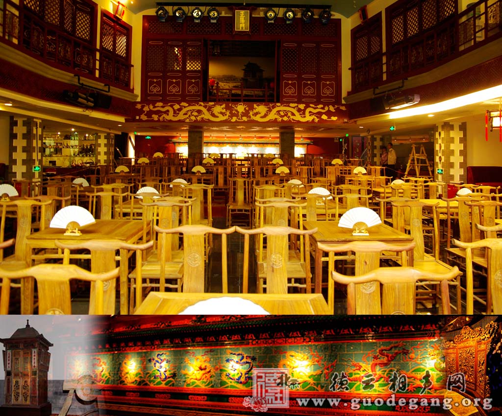踏入劇場(chǎng)首先映入眼簾的是雕刻精美的9*2.4米九龍壁;漫步向前,民間藝人現(xiàn)場(chǎng)制作手工藝品---吹糖人、捏面人、葡萄常等活靈活現(xiàn)的展現(xiàn)給觀眾;進(jìn)入劇場(chǎng),您會(huì)被一把歷經(jīng)百年的大刀所吸引,這就是當(dāng)年大刀張耍的那把180斤的大刀。大廳可容納五百余人,觀眾席準(zhǔn)備的都是古香古色的紅木桌椅,環(huán)繞大廳還設(shè)計(jì)有茶鋪、小吃鋪 ……