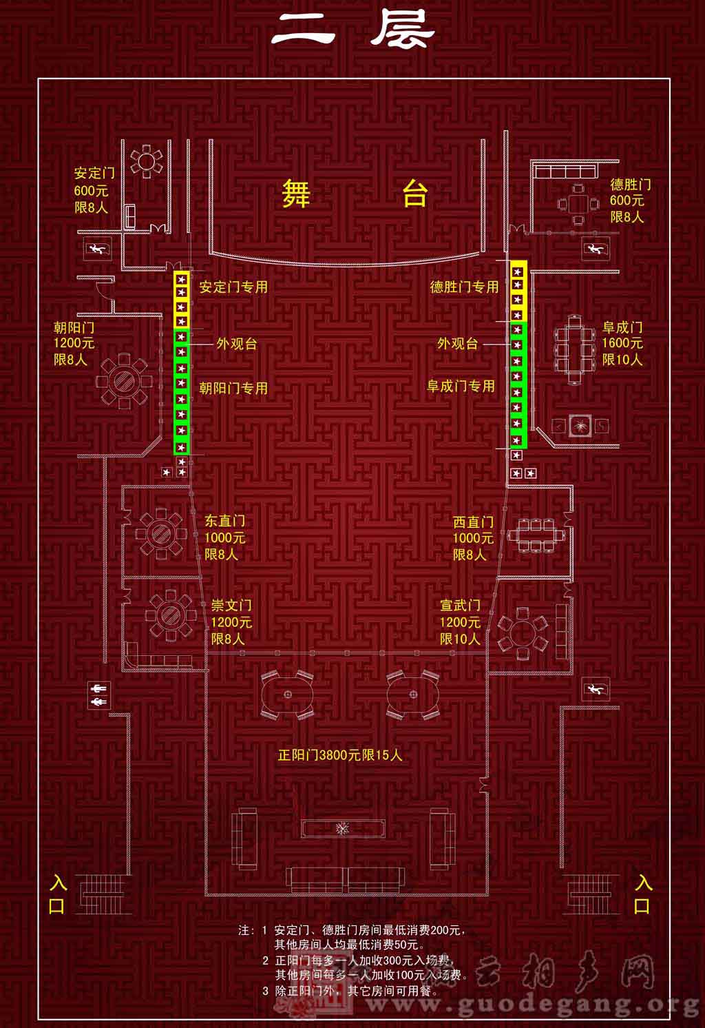 二層設(shè)計(jì):二層有九個(gè)包間,九個(gè)包間按著老北京的四九城門(mén)設(shè)計(jì),城門(mén)上的青磚瓦楞都設(shè)計(jì)成立體的,屋檐探出。九個(gè)包間對(duì)應(yīng)的九個(gè)城門(mén),每個(gè)城門(mén)代表不同意義,有的城門(mén)走水、有的城門(mén)走糧、還有專(zhuān)走龍車(chē)?guó)P輦的城門(mén)等等,所有這些含義都會(huì)在每個(gè)描述出來(lái)。正對(duì)舞臺(tái)的包間為德勝門(mén),德勝門(mén)包間設(shè)有龍座,擺放有九龍椅,包間內(nèi)大約可容納20人左右。 |