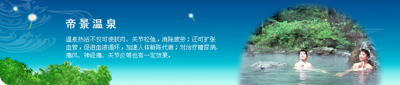 帝景溫泉度假村融匯世界溫泉沐浴文化風(fēng)情,是集溫泉沐浴,休閑保健,生態(tài)旅游以及完善的住/餐/娛/購配套于一體的新型綜合健康的溫泉休閑度假景區(qū)。包括公共溫泉區(qū),國(guó)際風(fēng)情區(qū)以及12棟VIP溫泉?jiǎng)e墅,商業(yè)街以及完善的SPA健康保健中心,客房,更衣,餐飲,娛樂配套等。二期將根據(jù)市場(chǎng)經(jīng)營(yíng)狀況,選擇溫泉生態(tài)觀光,健身運(yùn)動(dòng),溫泉養(yǎng)生等方面近一步深化和開發(fā)。